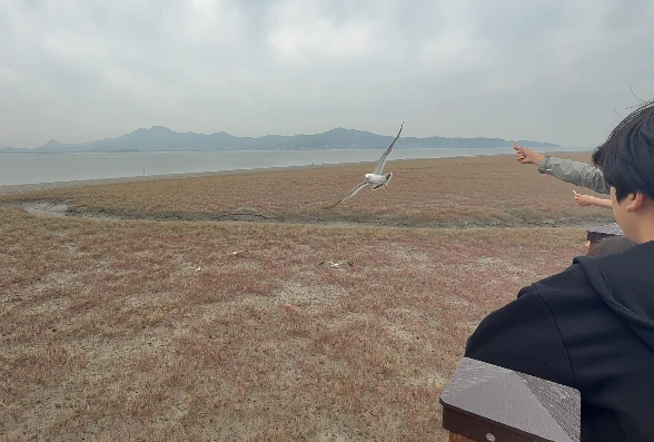 아직 개화 전이었지만, 7-8월에는 붉은빛으로 물든다는 설명에 아이들의 상상력이 자극되었어요. 대신 이곳에서는 수많은 갈매기가 반겨주었는데, 다른 관광객들이 새우깡으로 갈매기에게 먹이를 주는 모습을 보고 아이들도 도전해 보았습니다.